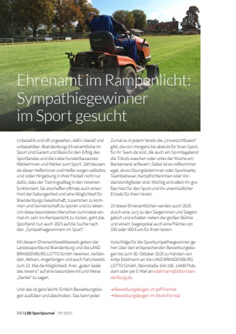 14/LSB Sportjournal09 2025LSB-ArenaEhrenamt im Rampenlicht: Sympathiegewinner im Sport gesuchtUnbezahlt und oft ungesehen, daf%u00fcr %u00fcberall und unbezahlbar: Brandenburgs Ehrenamtliche im Sport sind Garant und Basis f%u00fcr den Erfolg des Sportlandes und die Liebe hunderttausender M%u00e4rkerinnen und M%u00e4rker zum Sport. Zehntausende dieser Helferinnen und Helfer sorgen selbstlos und voller Hingebung in ihrer Freizeit nicht nur daf%u00fcr, dass der Trainingsalltag in den Vereinen funktioniert. Sie erschaffen oftmals auch einen Hort der Geborgenheit und eine M%u00f6glichkeit f%u00fcr Brandenburgs Gesellschaft, zusammen zu kommen und Gemeinschaft zu sp%u00fcren und zu leben. Um diese besonderen Menschen zumindest einmal im Jahr ins Rampenlicht zu r%u00fccken, geht das Sportland nun auch 2025 auf die Suche nach den %u201eSympathiegewinnern im Sport%u201c.Mit diesem Ehrenamtswettbewerb geben der Landessportbund Brandenburg und die LAND BRANDENBURG LOTTO GmbH Vereinen, Verb%u00e4nden, Aktiven, Angeh%u00f6rigen und auch Fans bereits zum 22. Mal die M%u00f6glichkeit, ihrer %u201eguten Seele des Vereins%u201c auf eine besondere Art und Weise %u201eDanke%u201c zu sagen.Und das ist ganz leicht: Einfach Bewerbungsbogen ausf%u00fcllen und abschicken. Das kann jeder. Zumal es in jedem Verein die %u201eUnverzichtbaren%u201c gibt, die von morgens bis abends f%u00fcr ihren Sport, f%u00fcr ihr Team da sind, die auch am Sonntagabend die Trikots waschen oder unter der Woche am Beckenrand anfeuern. Dabei ist es vollkommen egal, ob es %u00dcbungsleiterinnen oder Sportwarte, Teambetreuer, Kampfrichterinnen oder Vorstandsmitglieder sind. Wichtig sind allein ihr gro%u00dfes Herz f%u00fcr den Sport und ihr unerm%u00fcdlicher Einsatz f%u00fcr ihren Verein.20 dieser Ehrenamtlichen werden auch 2025 durch eine Jury zu den Siegerinnen und Siegern gek%u00fcrt und erhalten neben der gro%u00dfen B%u00fchne und einem Siegerpokal auch eine Pr%u00e4mie von 350 oder 500 Euro f%u00fcr ihren Verein.Vorschl%u00e4ge f%u00fcr die Sportsympathiegewinner gehen %u00fcber den entsprechenden Bewerbungsbogen bis zum 30. Oktober 2025 zu H%u00e4nden von Antje Edelmann an die LAND BRANDENBURG LOTTO GmbH, Steinstra%u00dfe 104-106, 14480 Potsdam oder per E-Mail an edelmann@lotto-brandenburg.de.Bewerbungsbogen im pdf-FormatBewerbungsbogen im Word-Format