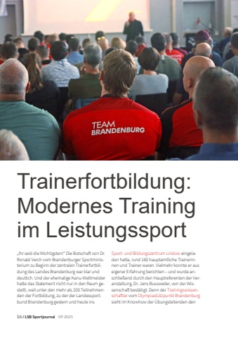 16/LSB Sportjournal09 2025LSB-Arena%u201eIhr seid die Wichtigsten!%u201c Die Botschaft von Dr. Ronald Verch vom Brandenburger Sportministerium zu Beginn der zentralen Trainerfortbildung des Landes Brandenburg war klar und deutlich. Und der ehemalige Kanu-Weltmeister hatte das Statement nicht nur in den Raum gestellt, weil unter den mehr als 200 Teilnehmenden der Fortbildung, zu der der Landessportbund Brandenburg gestern und heute ins Sport- und Bildungszentrum Lindow eingeladen hatte, rund 160 hauptamtliche Trainerinnen und Trainer waren. Vielmehr konnte er aus eigener Erfahrung berichten %u2013 und wurde anschlie%u00dfend durch den Hauptreferenten der Veranstaltung, Dr. Jens Bussweiler, von der Wissenschaft best%u00e4tigt. Denn der Trainingswissenschaftler vom Olympiast%u00fctzpunkt Brandenburgsieht im Knowhow der %u00dcbungsleitenden den Trainerfortbildung: Modernes Training im Leistungssport