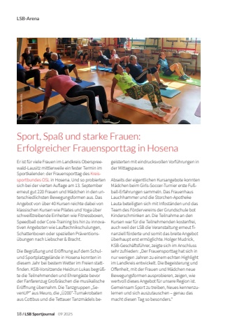 18/LSB Sportjournal09 2025LSB-ArenaEr ist f%u00fcr viele Frauen im Landkreis Oberspreewald-Lausitz mittlerweile ein fester Termin im Sportkalender: der Frauensporttag des Kreissportbundes OSL in Hosena. Und so probierten sich bei der vierten Auflage am 13. September erneut gut 220 Frauen und M%u00e4dchen in den unterschiedlichsten Bewegungsformen aus. Das Angebot von %u00fcber 40 Kursen reichte dabei von klassischen Kursen wie Pilates und Yoga %u00fcber schwei%u00dftreibende Einheiten wie Fitnessboxen, Speedball oder Core-Training bis hin zu innovativen Angeboten wie Lauftechnikschulungen, Schattenboxen oder speziellen Pr%u00e4ventions%u00fcbungen nach Liebscher & Bracht. Die Begr%u00fc%u00dfung und Er%u00f6ffnung auf dem Schulund Sportplatzgel%u00e4nde in Hosena konnten in diesem Jahr bei bestem Wetter im Freien stattfinden. KSB-Vorsitzende Heidrun Lukas begr%u00fc%u00dfte die Teilnehmenden und Ehreng%u00e4ste bevor der Fanfarenzug Gro%u00dfr%u00e4schen die musikalische Er%u00f6ffnung %u00fcbernahm. Die Tanzgruppen %u201eSevenUP%u201d aus Meuro, die %u201e%u00dc200%u201d-Turnakrobaten aus Cottbus und die Tettauer Tanzm%u00e4dels begeisterten mit eindrucksvollen Vorf%u00fchrungen in der Mittagspause. Abseits der eigentlichen Kursangebote konnten M%u00e4dchen beim Girls-Soccer-Turnier erste Fu%u00dfball-Erfahrungen sammeln. Das Frauenhaus Lauchhammer und die Storchen-Apotheke Lauta beteiligten sich mit Infost%u00e4nden und das Team des F%u00f6rdervereins der Grundschule bot Kinderschminken an. Die Teilnahme an den Kursen war f%u00fcr die Teilnehmenden kostenfrei, auch weil der LSB die Veranstaltung erneut finanziell f%u00f6rderte und somit das breite Angebot %u00fcberhaupt erst erm%u00f6glichte. Holger Mudrick, KSB-Gesch%u00e4ftsf%u00fchrer, zeigte sich im Anschluss sehr zufrieden: %u201eDer Frauensporttag hat sich in nur wenigen Jahren zu einem echten Highlight im Landkreis entwickelt. Die Begeisterung und Offenheit, mit der Frauen und M%u00e4dchen neue Bewegungsformen ausprobieren, zeigen, wie wertvoll dieses Angebot f%u00fcr unsere Region ist. Gemeinsam Sport zu treiben, Neues kennenzulernen und sich auszutauschen %u2013 genau das macht diesen Tag so besonders.%u201cSport, Spa%u00df und starke Frauen: Erfolgreicher Frauensporttag in HosenaFoto: Kreissportbund OSL
