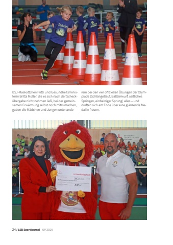 Sportjugend24/LSB Sportjournal09 2025BSJ-Maskottchen Fritzi und Gesundheitsministerin Britta M%u00fcller, die es sich nach der Scheck%u00fcbergabe nicht nehmen lie%u00df, bei der gemeinsamen Erw%u00e4rmung selbst noch mitzumachen, gaben die M%u00e4dchen und Jungen unter anderem bei den vier offiziellen %u00dcbungen der Olympiade (Schl%u00e4ngellauf, Ballzielwurf, seitliches Springen, einbeiniger Sprung) alles %u2013 und durften sich am Ende %u00fcber eine gl%u00e4nzende Medaille freuen.