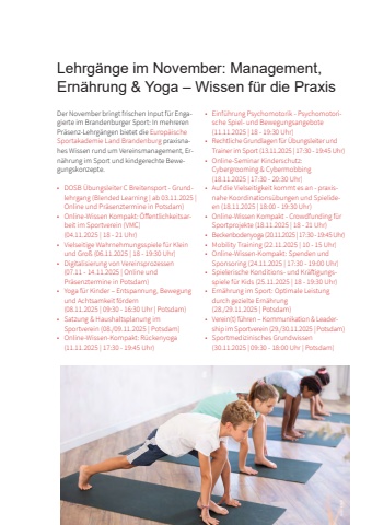 09 2025 LSB Sportjournal/29Der November bringt frischen Input f%u00fcr Engagierte im Brandenburger Sport: In mehreren Pr%u00e4senz-Lehrg%u00e4ngen bietet die Europ%u00e4ische Sportakademie Land Brandenburg praxisnahes Wissen rund um Vereinsmanagement, Ern%u00e4hrung im Sport und kindgerechte Bewegungskonzepte. %u2022 DOSB %u00dcbungsleiter C Breitensport - Grundlehrgang (Blended Learning | ab 03.11.2025 | Online und Pr%u00e4senztermine in Potsdam) %u2022 Online-Wissen Kompakt: %u00d6ffentlichkeitsarbeit im Sportverein (VMC) (04.11.2025 | 18 - 21 Uhr) %u2022 Vielseitige Wahrnehmungsspiele f%u00fcr Klein und Gro%u00df (06.11.2025 | 18 - 19:30 Uhr) %u2022 Digitalisierung von Vereinsprozessen (07.11 - 14.11.2025 | Online und Pr%u00e4senztermine in Potsdam) %u2022 Yoga f%u00fcr Kinder %u2013 Entspannung, Bewegung und Achtsamkeit f%u00f6rdern(08.11.2025 | 09:30 - 16:30 Uhr | Potsdam) %u2022 Satzung & Haushaltsplanung im Sportverein (08./09.11.2025 | Potsdam) %u2022 Online-Wissen-Kompakt: R%u00fcckenyoga (11.11.2025 | 17:30 - 19:45 Uhr) %u2022 Einf%u00fchrung Psychomotorik - Psychomotorische Spiel- und Bewegungsangebote (11.11.2025 | 18 - 19:30 Uhr) %u2022 Rechtliche Grundlagen f%u00fcr %u00dcbungsleiter und Trainer im Sport (13.11.2025 | 17:30 - 19:45 Uhr)%u2022 Online-Seminar Kinderschutz: Cybergrooming & Cybermobbing(18.11.2025 | 17:30 - 20:30 Uhr)%u2022 Auf die Vielseitigkeit kommt es an - praxisnahe Koordinations%u00fcbungen und Spielideen (18.11.2025 | 18:00 - 19:30 Uhr) %u2022 Online-Wissen Kompakt - Crowdfunding f%u00fcr Sportprojekte (18.11.2025 | 18 - 21 Uhr)%u2022 Beckenbodenyoga (20.11.2025 | 17:30 - 19:45 Uhr) %u2022 Mobility Training (22.11.2025 | 10 - 15 Uhr)%u2022 Online-Wissen-Kompakt: Spenden und Sponsoring (24.11.2025 | 17:30 - 19:00 Uhr)%u2022 Spielerische Konditions- und Kr%u00e4ftigungsspiele f%u00fcr Kids (25.11.2025 | 18 - 19:30 Uhr)%u2022 Ern%u00e4hrung im Sport: Optimale Leistung durch gezielte Ern%u00e4hrung (28./29.11.2025 | Potsdam) %u2022 Verein(t) f%u00fchren %u2013 Kommunikation & Leadership im Sportverein (29./30.11.2025 | Potsdam) %u2022 Sportmedizinisches Grundwissen (30.11.2025 | 09:30 - 18:00 Uhr | Potsdam) Lehrg%u00e4nge im November: Management, Ern%u00e4hrung & Yoga %u2013 Wissen f%u00fcr die Praxis Foto: ESAB