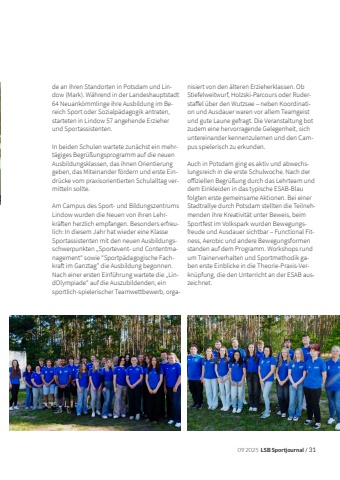 09 2025 LSB Sportjournal/31de an ihren Standorten in Potsdam und Lindow (Mark). W%u00e4hrend in der Landeshauptstadt 64 Neuank%u00f6mmlinge ihre Ausbildung im Bereich Sport oder Sozialp%u00e4dagogik antraten, starteten in Lindow 57 angehende Erzieher und Sportassistenten. In beiden Schulen wartete zun%u00e4chst ein mehrt%u00e4giges Begr%u00fc%u00dfungsprogramm auf die neuen Ausbildungsklassen, das ihnen Orientierung geben, das Miteinander f%u00f6rdern und erste Eindr%u00fccke vom praxisorientierten Schulalltag vermitteln sollte. Am Campus des Sport- und Bildungszentrums Lindow wurden die Neuen von ihren Lehrkr%u00e4ften herzlich empfangen. Besonders erfreulich: In diesem Jahr hat wieder eine Klasse Sportassistenten mit den neuen Ausbildungsschwerpunkten %u201eSportevent- und Contentmanagement%u201c sowie %u201cSportp%u00e4dagogische Fachkraft im Ganztag%u201d die Ausbildung begonnen. Nach einer ersten Einf%u00fchrung wartete die %u201eLindOlympiade%u201c auf die Auszubildenden, ein sportlich-spielerischer Teamwettbewerb, organisiert von den %u00e4lteren Erzieherklassen. Ob Stiefelweitwurf, Holzski-Parcours oder Ruderstaffel %u00fcber den Wutzsee %u2013 neben Koordination und Ausdauer waren vor allem Teamgeist und gute Laune gefragt. Die Veranstaltung bot zudem eine hervorragende Gelegenheit, sich untereinander kennenzulernen und den Campus spielerisch zu erkunden. Auch in Potsdam ging es aktiv und abwechslungsreich in die erste Schulwoche. Nach der offiziellen Begr%u00fc%u00dfung durch das Lehrteam und dem Einkleiden in das typische ESAB-Blau folgten erste gemeinsame Aktionen. Bei einer Stadtrallye durch Potsdam stellten die Teilnehmenden ihre Kreativit%u00e4t unter Beweis, beim Sportfest im Volkspark wurden Bewegungsfreude und Ausdauer sichtbar %u2013 Functional Fitness, Aerobic und andere Bewegungsformen standen auf dem Programm. Workshops rund um Trainerverhalten und Sportmethodik gaben erste Einblicke in die Theorie-Praxis-Verkn%u00fcpfung, die den Unterricht an der ESAB auszeichnet.
