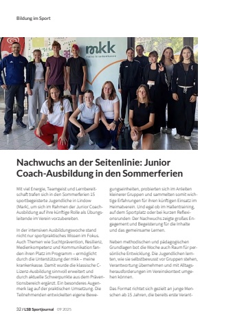 32/LSB Sportjournal09 2025Bildung im SportMit viel Energie, Teamgeist und Lernbereitschaft trafen sich in den Sommerferien 15 sportbegeisterte Jugendliche in Lindow (Mark), um sich im Rahmen der Junior CoachAusbildung auf ihre k%u00fcnftige Rolle als %u00dcbungsleitende im Verein vorzubereiten. In der intensiven Ausbildungswoche stand nicht nur sportpraktisches Wissen im Fokus. Auch Themen wie Suchtpr%u00e4vention, Resilienz, Medienkompetenz und Kommunikation fanden ihren Platz im Programm %u2013 erm%u00f6glicht durch die Unterst%u00fctzung der mkk %u2013 meine krankenkasse. Damit wurde die klassische CLizenz-Ausbildung sinnvoll erweitert und durch aktuelle Schwerpunkte aus dem Pr%u00e4ventionsbereich erg%u00e4nzt. Ein besonderes Augenmerk lag auf der praktischen Umsetzung. Die Teilnehmenden entwickelten eigene Bewegungseinheiten, probierten sich im Anleiten kleinerer Gruppen und sammelten somit wichtige Erfahrungen f%u00fcr ihren k%u00fcnftigen Einsatz im Heimatverein. Und egal ob im Hallentraining, auf dem Sportplatz oder bei kurzen Reflexionsrunden: Der Nachwuchs zeigte gro%u00dfes Engagement und Begeisterung f%u00fcr die Inhalte und das gemeinsame Lernen. Neben methodischen und p%u00e4dagogischen Grundlagen bot die Woche auch Raum f%u00fcr pers%u00f6nliche Entwicklung. Die Jugendlichen lernten, wie sie selbstbewusst vor Gruppen stehen, Verantwortung %u00fcbernehmen und mit Alltagsherausforderungen im Vereinskontext umgehen k%u00f6nnen. Das Format richtet sich gezielt an junge Menschen ab 15 Jahren, die bereits erste VerantNachwuchs an der Seitenlinie: Junior Coach-Ausbildung in den Sommerferien Foto: ESAB