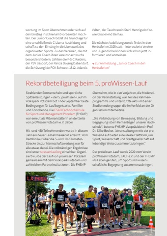 09 2025 LSB Sportjournal/33wortung im Sport %u00fcbernehmen oder sich auf den Einstieg ins Ehrenamt vorbereiten m%u00f6chten. Der Junior Coach bildet die Grundlage f%u00fcr eine anschlie%u00dfende C-Lizenz-Ausbildung und schafft so den Einstieg in die Lizenzwelt des organisierten Sports. Zu den Vereinen, die mit dem Junior Coach ihren Vereinsnachwuchs besonders f%u00f6rdern, z%u00e4hlten die F-S-C Raiders, der PSV Basdorf, der Panda Dojang Dabendorf, die Sch%u00fctzengilde PCK Schwedt 1812, Atlantis Velten, der Tauchverein Stahl Hennigsdorf sowie Gl%u00fcckskind Bernau. Die n%u00e4chste Ausbildungsrunde findet in den Herbstferien 2025 statt %u2013 interessierte Vereine und Jugendliche k%u00f6nnen sich schon jetzt informieren und anmelden. Zur Anmeldung: %u201eJunior Coach in den Herbstferien%u201c Strahlender Sonnenschein und sportliche Spitzenleistungen %u2013 der 5. proWissen-Lauf im Volkspark Potsdam bot Ende September beste Bedingungen f%u00fcr Laufbegeisterte, Familien und Forschende. Die ESAB Fachhochschule f%u00fcr Sport und Management Potsdam (FHSMP) war erneut als Mitveranstalterin an der Seite von proWissen Potsdam e. V. dabei.Mit rund 450 Teilnehmenden wurde in diesem Jahr ein neuer Teilnahmerekord erreicht. Vom Bambinilauf %u00fcber die 5- und 10-KilometerStrecke bis zur Mannschaftswertung war f%u00fcr alle etwas dabei. Die vollst%u00e4ndigen Ergebnisse sind unter strassenlauf.org einsehbar. Organisiert wurde der Lauf von proWissen Potsdam gemeinsam mit dem Volkspark Potsdam und zahlreichen Partnerinstitutionen. Die FHSMP %u00fcbernahm, wie in den Vorjahren, die Moderation der Veranstaltung, war Teil des Rahmenprogramms und unterst%u00fctzte aktiv mit einer Studierendengruppe, die im Vorfeld an der Organisation mitarbeitete. %u201eDie Verbindung von Bewegung, Bildung und Begegnung ist ein Kernanliegen unserer Hochschule%u201c, betonte FHSMP-Vizepr%u00e4sidentin Prof. Dr. Silke Becker. %u201eVeranstaltungen wie der proWissen-Lauf bieten eine ideale Plattform, um Sport, Wissenschaft und Stadtgesellschaft auf lebendige Weise zusammenzubringen.%u201c Der proWissen-Lauf wurde 2020 vom Verein proWissen Potsdam, LAUF e.V. und der FHSMP ins Leben gerufen, um Sport und wissenschaftliche Begegnung zusammenzubringen. Rekordbeteiligung beim 5. proWissen-Lauf Foto: ESAB