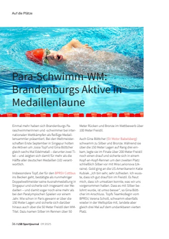 Auf die Pl%u00e4tze36/LSB Sportjournal09 2025Einmal mehr haben sich Brandenburgs Paraschwimmerinnen und -schwimmer bei internationalen Wettk%u00e4mpfen als flei%u00dfige Medaillensammler pr%u00e4sentiert. Bei den Weltmeisterschaften Ende September in Singapur holten die Aktiven um Josia Topf und Gina B%u00f6ttcher gleich sechs Mal Edelmetall %u2013 darunter zwei Titel %u2013 und zeigten sich damit f%u00fcr mehr als die H%u00e4lfte aller deutschen Medaillen (10) verantwortlich.Insbesondere Topf, der f%u00fcr den BPRSV Cottbusins Becken geht, best%u00e4tigte als nunmehriger Doppelweltmeister seine Ausnahmestellung in Singapur und sicherte sich insgesamt vier Medaillen %u2013 und damit sogar noch eine mehr als bei den Paralympischen Spielen vor einem Jahr. Wie schon in Paris gewann er %u00fcber die 150 Meter Lagen und sicherte sich dar%u00fcber hinaus auch %u00fcber die 50 Meter Freistil den WMTitel. Dazu kamen Silber im Rennen %u00fcber 50 Meter R%u00fccken und Bronze im Wettbewerb %u00fcber 100 Meter Freistil.Auch Gina B%u00f6ttcher (SV Motor Babelsberg) schwamm zu Silber und Bronze. W%u00e4hrend sie %u00fcber die 150 Meter Lagen auf Rang drei einkam, legte sie im Finale %u00fcber 200 Meter Freistil noch einen drauf und sicherte sich in einem Kopf-an-Kopf-Rennen um den zweiten Platz schlie%u00dflich Silber vor mit Mira Larionova (Ukraine). Gold ging an die US-Amerikanerin Katie Kubiak. %u201eIch bin sehr, sehr zufrieden. Ich wusste, dass ich gut drauf bin im Freistil. Es freut mich, dass ich umsetzen konnte, was wir uns vorgenommen hatten. Dass es mit Silber belohnt wurde, ist umso besser%u201c, so Gina B%u00f6ttcher im Anschluss. Topfs Teamkollegin vom BPRSV, Verena Schott, schwamm ebenfalls wieder in der Weltspitze mit, landete aber gleich drei Mal auf dem undankbaren vierten Platz.Foto: Ralf Kuckuck | DBSPara-Schwimm-WM: Brandenburgs Aktive in Medaillenlaune
