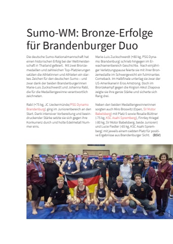 09 2025 LSB Sportjournal/37Die deutsche Sumo-Nationalmannschaft hat einen historischen Erfolg bei der Weltmeisterschaft in Thailand gefeiert. Mit zwei Bronzemedaillen und zahlreichen Top-Platzierungen setzten die Athletinnen und Athleten ein starkes Zeichen f%u00fcr den deutschen Sumo %u2013 und zwar dank der beiden Brandenburgerinnen Marie-Luis Zuckschwerdt und Johanna Rabl, die f%u00fcr die Medaillengewinne verantwortlich zeichneten. Rabl (+75 kg, JC Ueckerm%u00fcnde/PSG Dynamo Brandenburg) ging im Juniorenbereich an den Start. Dank intensiver Vorbereitung und beeindruckender St%u00e4rke setzte sie sich gegen ihre Konkurrenz durch und holte Edelmetall Nummer eins. Marie-Luis Zuckschwerdt (+80 kg, PSG Dynamo Brandenburg) schrieb hingegen im Erwachsenenbereich Geschichte. Nach einj%u00e4hriger Verletzungspause feierte sie mit ihrer Bronzemedaille im Schwergewicht ein fulminantes Comeback. Im Halbfinale unterlag sie zwar der US-Amerikanerin Eros Amstrong. Doch im Bronzekampf gegen die Kirgisin Aikol Ziiapova zeigte sie ihre ganze St%u00e4rke und sicherte sich Rang drei. Neben den beiden Medaillengewinnerinnen sorgten auch Miro Broswitz (Open, SV Motor Babelsberg) mit Platz 5 sowie Rosalie B%u00fcttner (-75 kg, KSC Asahi Spremberg), Finnley Kriegel (-80 kg, SV Motor Babelsberg, beide Junioren) und Lucie Fiedler (-65 kg, KSC Asahi Spremberg) mit jeweils einem siebten Platz f%u00fcr positive Ergebnisse aus Brandenburger Sicht. (BSV)Sumo-WM: Bronze-Erfolge f%u00fcr Brandenburger DuoFoto: BSV