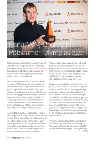 38/LSB Sportjournal09 2025Auf die Pl%u00e4tzeRuder-Juniorenweltmeister Mads Schmied ist %u201eSporthilfe Juniorsportler 2025%u201c. Der Potsdamer Sportsch%u00fcler, der f%u00fcr den RC Potsdam ins Boot steigt, ist damit der erste Ruderer, der sich Deutschlands wichtigsten Nachwuchspreis im Sport sichern konnte.Der 18-J%u00e4hrige hatte sich im Sommer bei der Junioren-WM in Litauen als erster deutscher Nachwuchsruderer seit elf Jahren den prestigetr%u00e4chtigen Weltmeistertitel im Einer gesichert. Nun setzte er sich in einem %u00f6ffentlichen Online-Voting gegen Kanurennsport-Juniorenweltmeisterin Caroline Heuser, Niels McDonald, Sieger der Junioren-French Open im Tennis, Eisschnelllauf-Juniorenweltmeister Finn Sonnekalb und Aodh%u00e1n Umlauf, Juniorenweltmeister im Speedklettern, durch.Auch mit Blick auf diese hochrangige Konkurrenz zeigte sich Schmied bei der Auszeichnung auf der B%u00fchne %u00fcberw%u00e4ltigt: %u201eIch habe aufgrund der Erfolge der anderen Nominierten kaum damit gerechnet, dass ich gewinne und freue mich jetzt mega. Danke an alle, die mich gew%u00e4hlt haben. Diese Auszeichnung motiviert mich nur noch mehr, weiterzumachen.%u201cWie besonders diese Auszeichnung ist, zeigt auch die Liste der Vorg%u00e4ngerinnen und Vorg%u00e4nger von Mad Schmied, tauchen doch so illustre Namen wie Michael Gro%u00df (1981), Franziska van Almsick (1992), Timo Boll (1997), Ronald Rauhe (1998), Magdalena Neuner (2007/2008) und Niklas Kaul (2017) auf.Dass er nun dazugeh%u00f6rt, kommt nicht von ungef%u00e4hr. %u201eMads Schmied ist ein herausragender Nachwuchsathlet, der mit seinen gro%u00dfartigen Leistungen nicht nur die Ruder-Welt beeindruckt. Er reiht sich mit der Auszeichnung in die beeindruckende Runde der bisherigen herausragenden Juniorsportler ein. Ich bin sicher, dass er mit seinem Talent, seinem Flei%u00df und seinem Charakter auch weiterhin f%u00fcr Furore sorgen und Erfolge feiern wird%u201c, w%u00fcrdigt Karin Orgeldinger, im Sporthilfe-Vorstand zust%u00e4ndig f%u00fcr die Athletenf%u00f6rderung, den %u201eSporthilfe Juniorsportler 2025%u201c. Im Rahmen der Veranstaltung wurde zudem mit Schwimmer Josia Topf in der Kategorie Parasport als %u201cSporthilfe Juniorsportler 2025%u201d ein weiterer Brandenburger Aktiver gew%u00fcrdigt.(DSH)Kanu: WM-Bronze f%u00fcr Potsdamer Olympiasieger Foto: picture alliance f%u00fcr Sporthilfe
