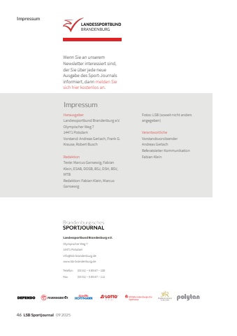 Impressum46LSB Sportjournal09 2025Landessportbund Brandenburg e.V.Olympischer Weg 714471 Potsdaminfo@lsb-brandenburg.dewww.lsb-brandenburg.deTelefon: (03 31) %u2013 5 85 67 %u2013 100Fax: (03 31) %u2013 5 85 67 %u2013 111HerausgeberLandessportbund Brandenburg e.V.Olympischer Weg 714471 PotsdamVorstand: Andreas Gerlach, Frank G.Krause, Robert BuschRedaktionTexte: Marcus Gansewig, FabianKlein, ESAB, DOSB, BSJ, DSH, BSV, MTBRedaktion: Fabian Klein, Marcus GansewigImpressumWenn Sie an unseremNewsletter interessiert sind,der Sie %u00fcber jede neueAusgabe des Sport-Journalsinformiert, dann melden Siesich hier kostenlos an.Fotos: LSB (soweit nicht anders angegeben)Verantwortliche VorstandsvorsitzenderAndreas GerlachReferatsleiter KommunikationFabian Klein