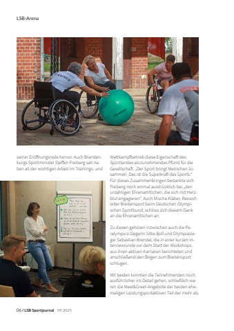 LSB-Arena06/LSB Sportjournal09 2025seiner Er%u00f6ffnungsrede hervor. Auch Brandenburgs Sportminister Steffen Freiberg sah neben all der wichtigen Arbeit im Trainings- und Wettkampfbetrieb diese Eigenschaft des Sportlandes als zunehmendes Pfund f%u00fcr die Gesellschaft. %u201eDer Sport bringt Menschen zusammen. Das ist die Superkraft des Sports.%u201c F%u00fcr dieses Zusammenbringen bedankte sich Freiberg noch einmal ausdr%u00fccklich bei %u201eden unz%u00e4hligen Ehrenamtlichen, die sich mit Herzblut engagieren%u201c. Auch Mischa Kl%u00e4ber, Ressortleiter Breitensport beim Deutschen Olympischen Sportbund, schloss sich diesem Dank an die Ehrenamtlichen an.Zu diesen geh%u00f6ren inzwischen auch die Paralympics-Siegerin Silke Boll und Olympiasieger Sebastian Brendel, die in einer kurzen Interviewrunde vor dem Start der Workshops aus ihren aktiven Karrieren berichteten und anschlie%u00dfend den Bogen zum Breitensport schlugen.Mit beiden konnten die Teilnehmenden noch ausf%u00fchrlicher ins Detail gehen, schlie%u00dflich waren die Meet&Greet-Angebote der beiden ehemaligen Leistungsportaktiven Teil der mehr als