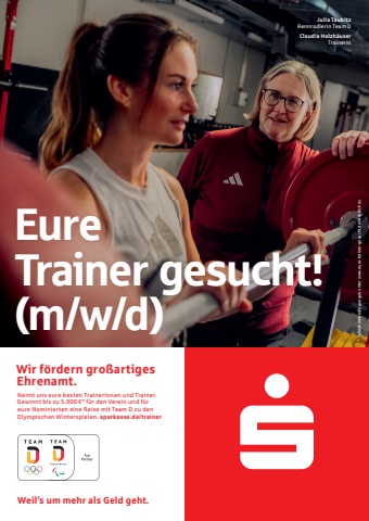 09 2025 LSB Sportjournal/09Weil%u2019s um mehr als Geld geht.EureTrainer gesucht!(m/w/d)Rennrodlerin Team DClaudia Holzh%u00e4userWir f%u00f6rdern gro%u00dfartiges Ehrenamt.Nennt uns eure besten Trainerinnen und Trainer. Gewinnt bis zu 5.000 %u20ac* f%u00fcr den Verein und f%u00fcr eure Nominierten eine Reise mit Team D zu den Olympischen Winterspielen. sparkasse.de/trainer